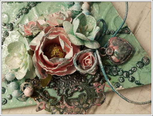 Metalowy, mocno spatynowany uchwyt przymocowany do frontowej ścianki dodał niezwykłego uroku całemu pudełku i dopełnił całości.